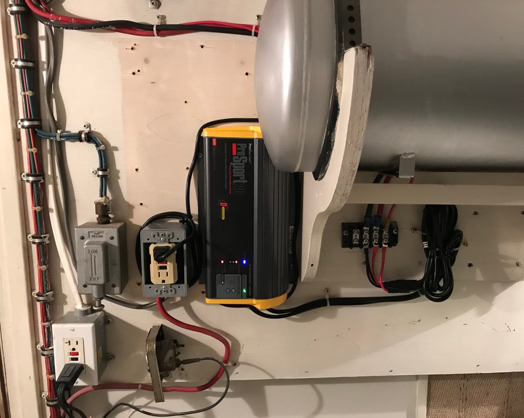 And then there was the 12V side. PO also installed a Garmin Nav suite with radar/autopilot and a new AIS VHF. All this is 12V of course. So there were new breakers, switches and another 12V battery. For reasons I’ll never understand they left the old technology Guest charger in place. The thing emitted a LOUD 60HZ buzz which was the reason I wanted it out. But, when I took it out three (!!!) hard wired CO alarms and the Nav systems started screaming that their voltage was low. In fact it was at 9.7VDC. So the battery was in fact not charging and the charger was carrying the entire 12VDC load directly. Closer inspection of the group 31 battery revealed that it was not, as I originally thought, sealed. There were in fact 6 caps, it’s just that they were flush with the top. It took .6 gallons of distilled water. Fortunately it didn’t appear dead dead as after 16 or so hours the charger did go to float charge.