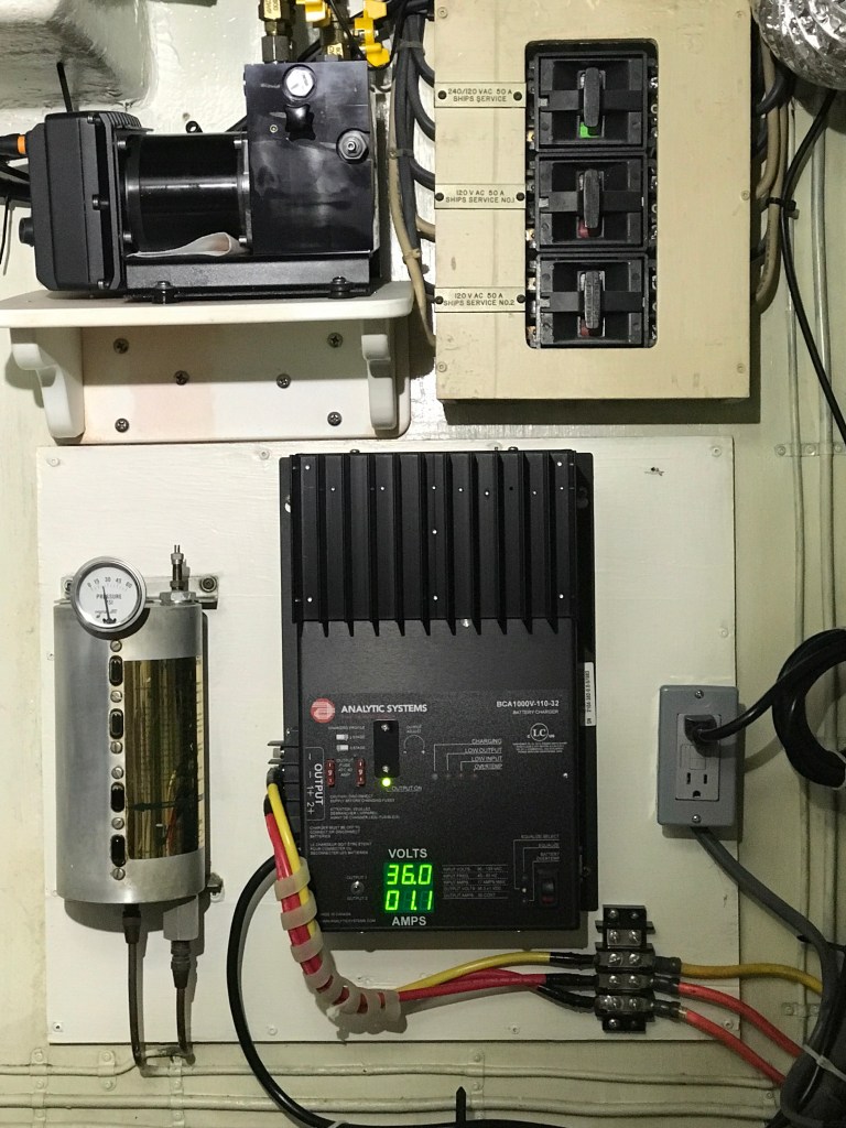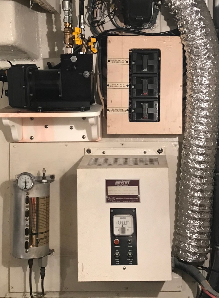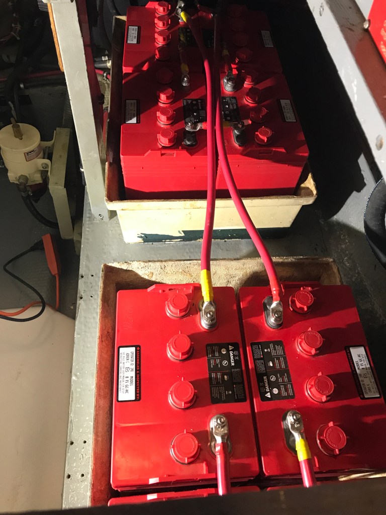 Originally the boats were all 32V DC, with a converter for some 12V stuff like engine gauges, radios etc. In the boating world 32V lost to 12/24/48. Kinda like the Betamax and VHS thing. Many people convert to 24VDC. Mine is still in pretty darn good shape though. So there’s lighting, Galleymaid head pumps, water pump, the Ideal anchor winch and a few more things. 8 humongo 8V batteries, 4 in series each side. SB is start only, port is also house bank. Two 32V alternators, starters on the engines and a big charger.
