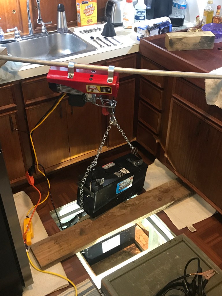 Interestingly they turned out lighter than I thought they would. 90 pounds each. This means 360 pounds verus the 480 of the 8 Rolls… This is not helping my list to Port. But there’s something else in the works there. But it also means there’s a lot more lead in the Rolls, which makes them a better battery! Meanwhile getting the 8 new batteries down and into the hole was work, but manageable. Some quality time making new cables and they are good to go.