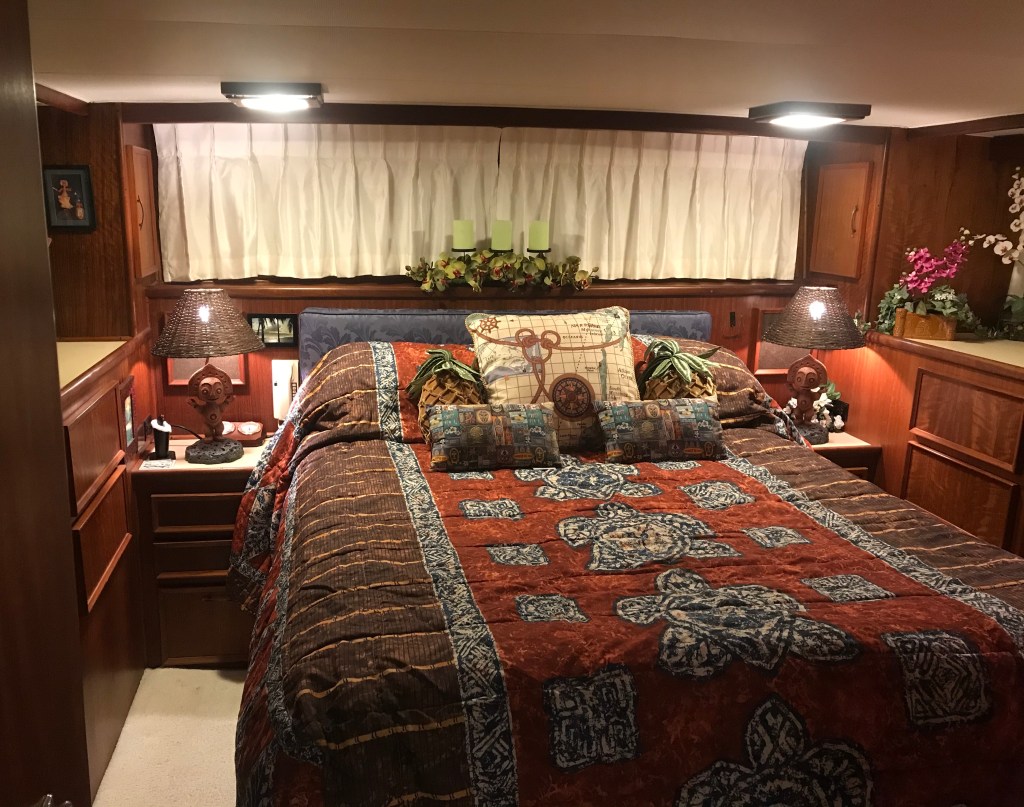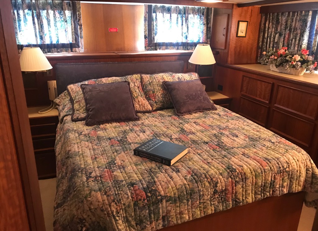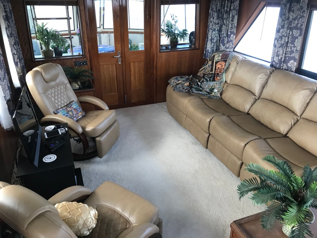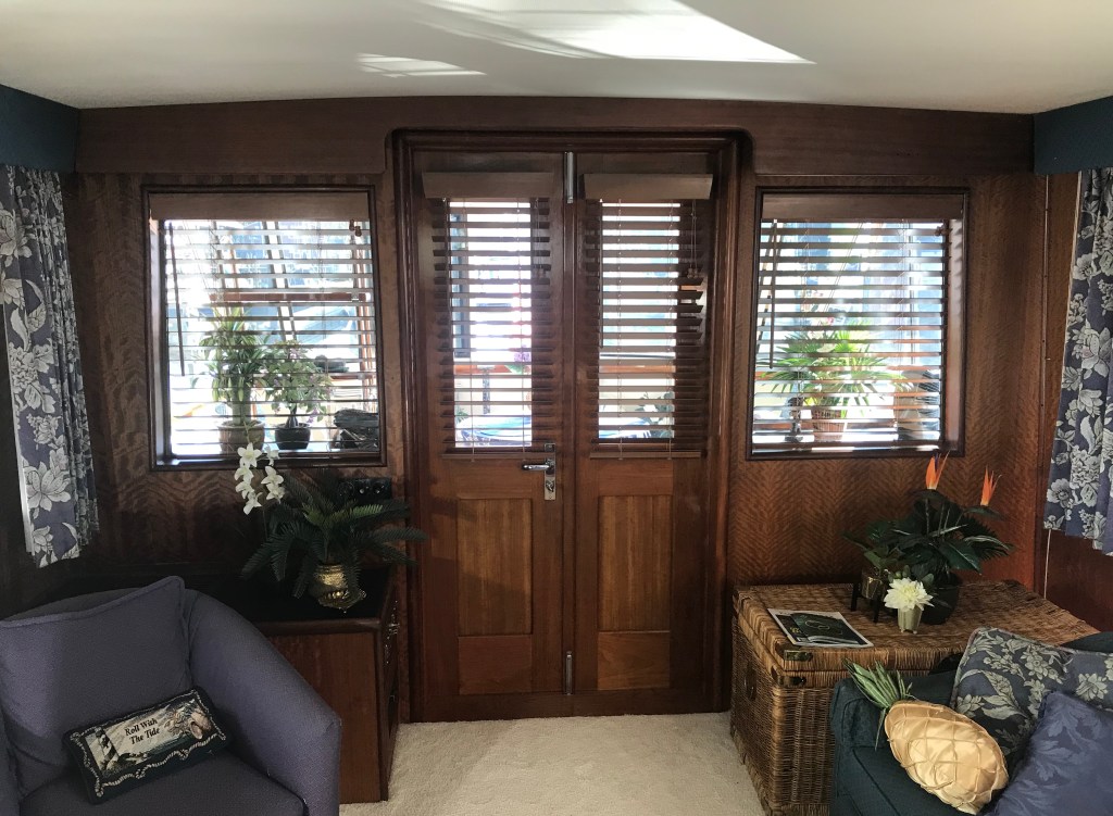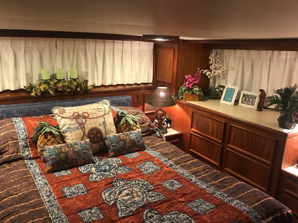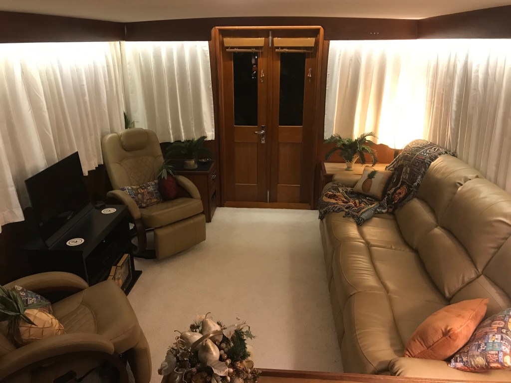 The veneer is gorgeous. We are not touching it. Though Hatteras used a lot of Afromosia, it appears ours is Mozambique. (a relative of rosewood). The cabinet case in the middle of the room initially seemed odd. But having that storage at the helm for sundry equipment is handy. The furniture and curtains were very good quality, just not our thing. The carpet a wee bit tired. We installed new wood-looking blinds (the real thing at some point in the future) and new off white curtains.