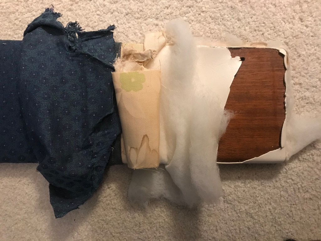 Original plan was also to use cutoffs from the curtains (we’re buying off the shelf 60″ curtains) to redo the cornice. Just for giggles I started peeling back the layers (4 it turned out) and found gorgeous original finished mahogany. The fabric layers were stapled but thankfully 99% of the staples were on the back…. 500,000 of them. HOURS and HOURS I spent puling them out. But it was worth it…..