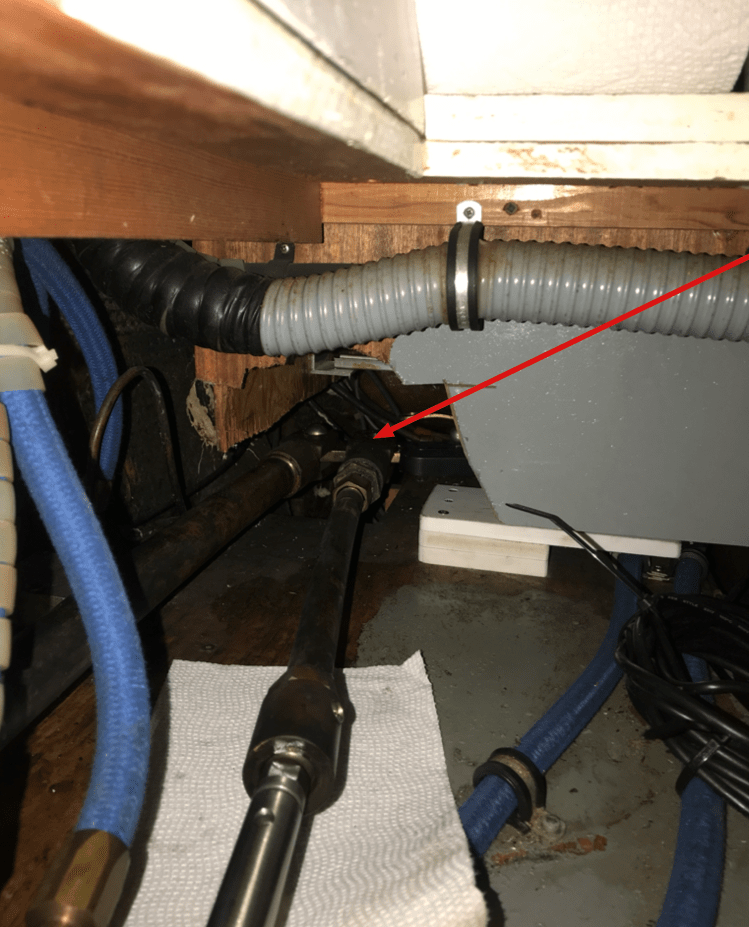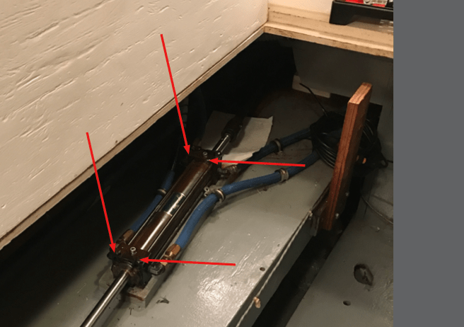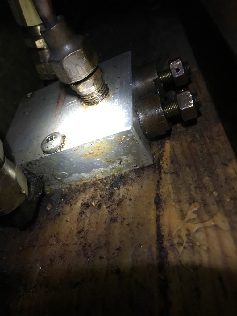 So, here is the steering ram under the bed. Nice and accessible. Note the slight “bleeding” on far end.