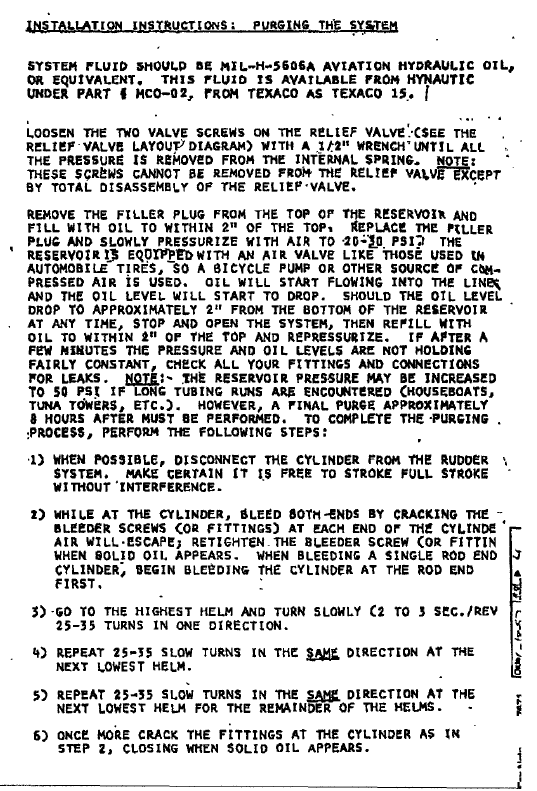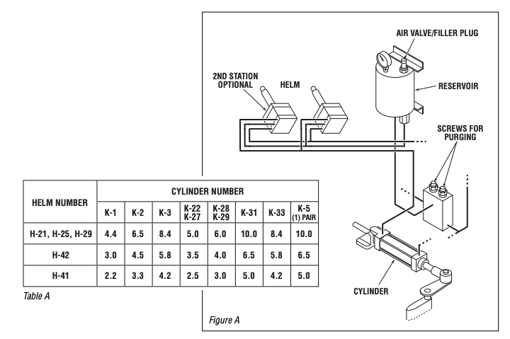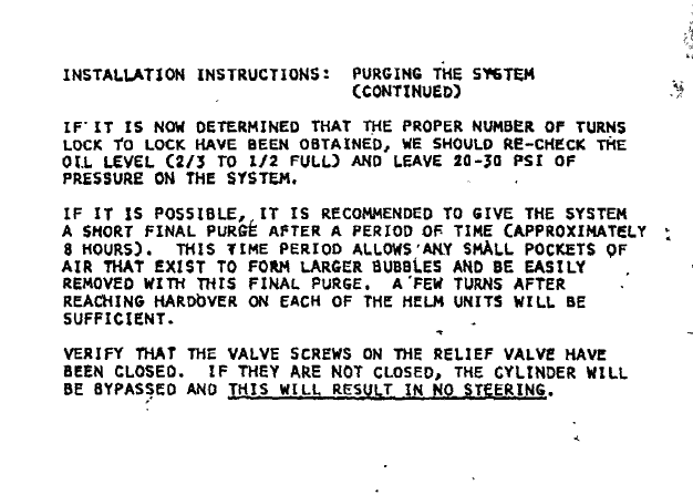 The little box with “screws for purging” are the pressure relief valves. (MSV21 is the model) Their job is to relieve the steering pressure should you exceed 950 !!! psi. Yes that’s a lot. There’s a reason we use hydraulics when there’s large forces needed. By releasing them the bypass pressure is a lot lower and by spinning the wheels many turns in both directions, in a proper sequence, you can circulate fluid in the system at a larger rate, so air ends up in the reservoir. The reservoir is filled with fluid, 1/2-2/3 full, and then gets a 25-30 psi pressure head on it. (air…. with a bicycle pump). The autopilot pump (not shown) is teed in just like the helm pumps. The number in the chart is the supposed number of turns hard over to hard over.