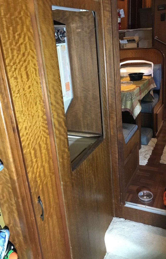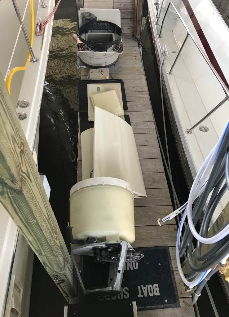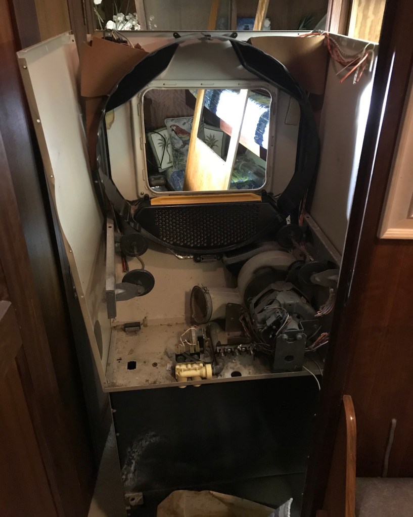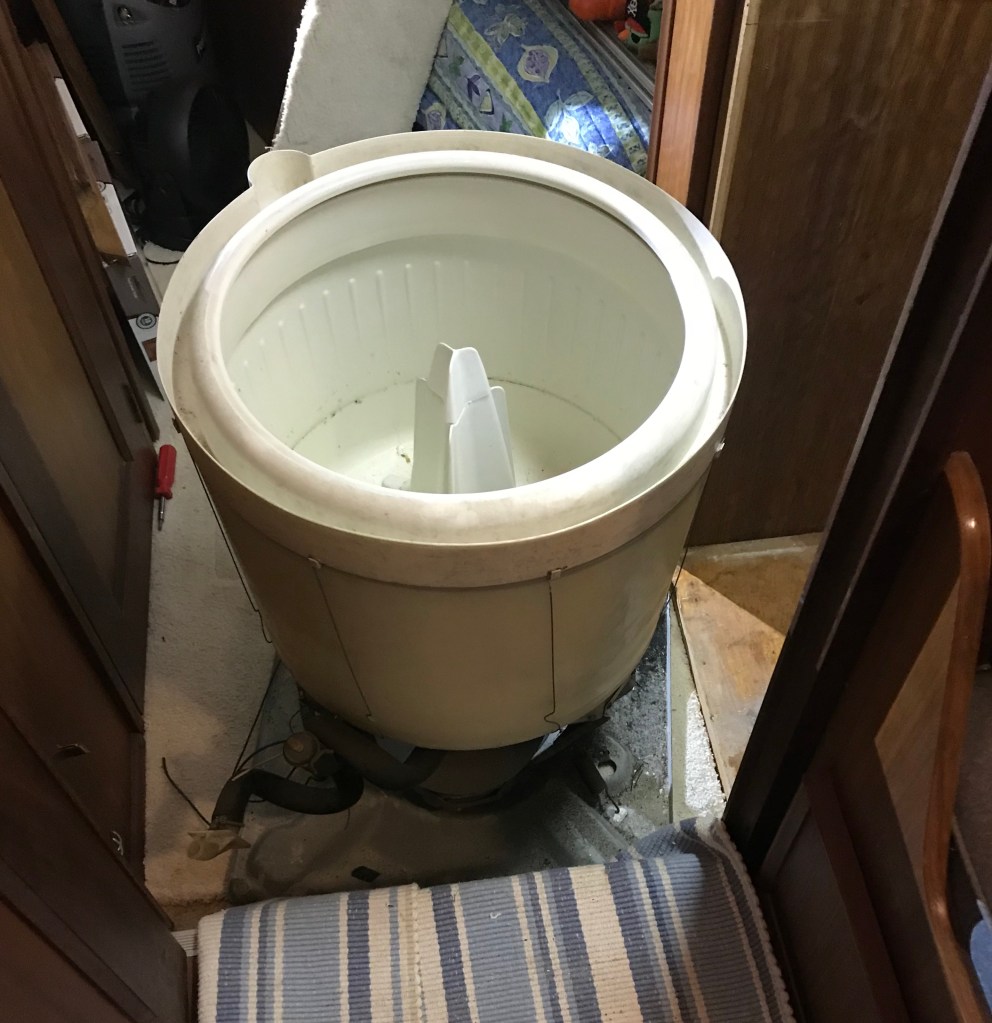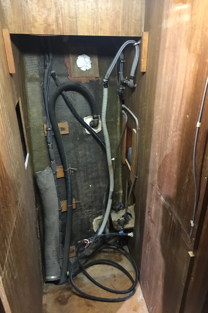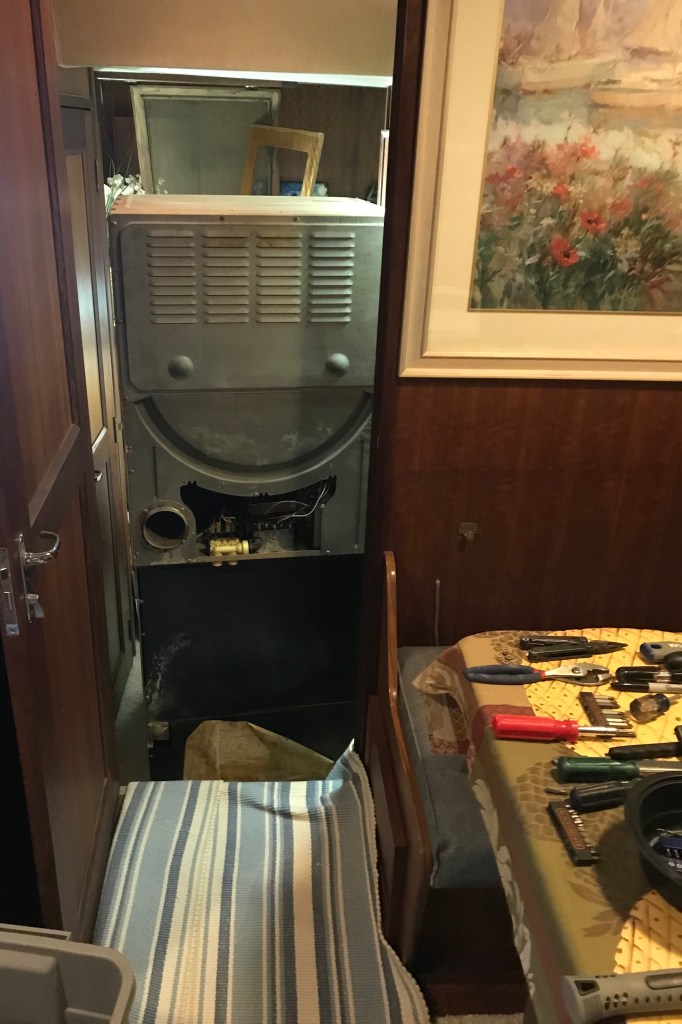 It was dead when we purchased it. A yellow post it note stated: “Needs new fill valve”. It looked like it was at least 30 years old, if not original to the boat. And, Hatteras beautifully built it in with mahogany panel and trim. Getting to the back was a major operation. So, going through all that I decided replacing it was almost as much work and we’d have a fresh machine. Also, I decided to go to a combo unit which would free up some major space above for much needed storage.