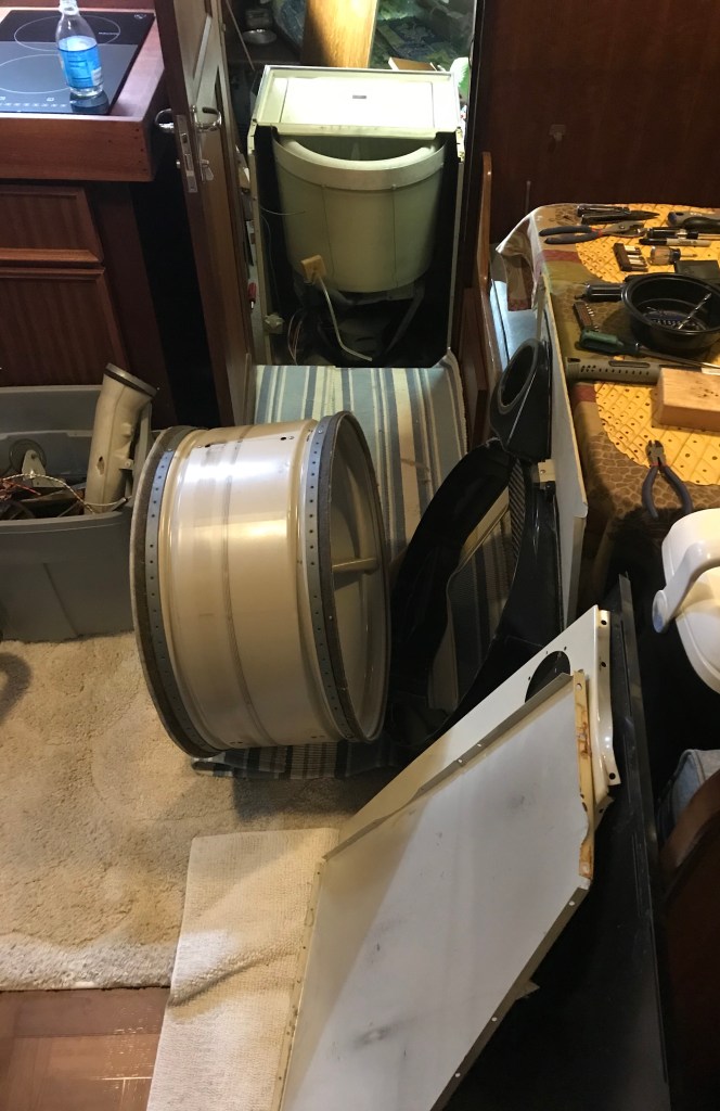 From the forum I knew that it would not fit through any of the openings to get it to the dock, other than the forward hatch. (After removing some trim in some cases.) This of course required either 4 people or some mechanical lifting be it a crane/travel lift or a gantry setup on deck. As part of the winterization process I needed to run “pink” through the supply lines, so I had to get to the hoses in the back of the washer. When I found the little access panel that gave me a sort of peek into the world behind the unit I decided I might as well take it out now.