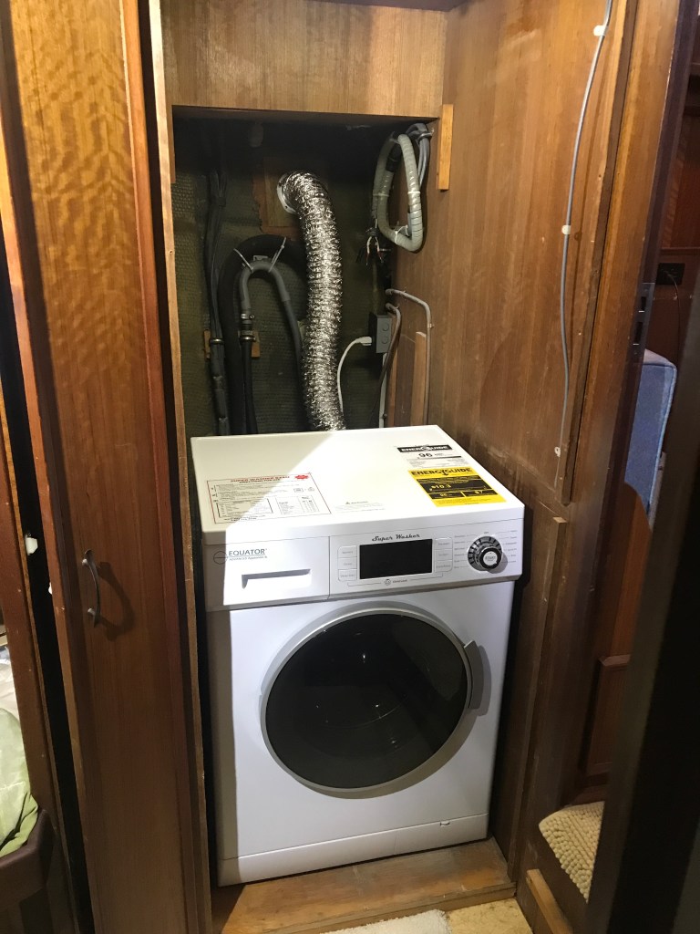 So time for new. Settled on another stacker. Yes, combo would save me a lot of space but they don’t wash or dry as well. Plus, I ordered the wrong thing. I THOUGHT I ordered a combo, and a straight washer arrived. Didn’t realize it until it was in the boat. But, at 22-1/2″ it fit through all the door openings. It was meant to be. Ordered the dryer to go on top after that. Washer is Equator EW824-N. Dryer is Equator ED850-V They are available as a package.